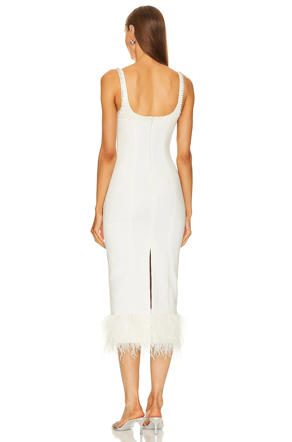 - Crepe fabric with crystal embellished trim, feather embellished hem and back vent