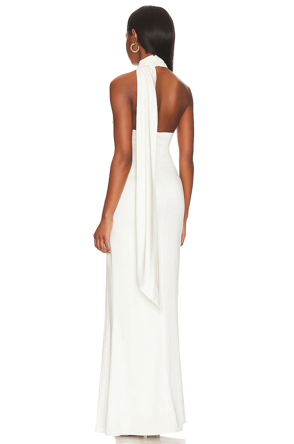 Polyester blend. Imported. Dry clean recommended. Fully lined. Hidden back zipper closure. Mockneck styling with back loop button closure and attached sash accent. Matte sateen fabric with side seam slit. Revolve Style No. LOVF-WD3638. Manufacturer Style No. ACD2290 S23.
